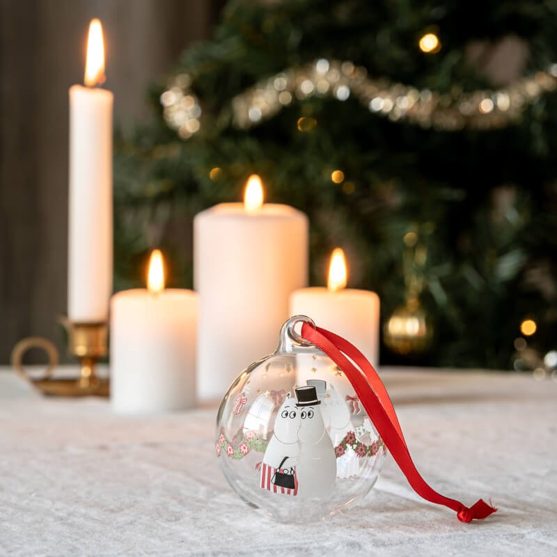 Julkulan har ett härligt julmotiv med Muminpappan och Muminmamma, glaskula som passar bra under julen.