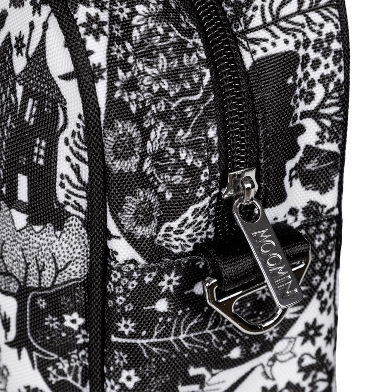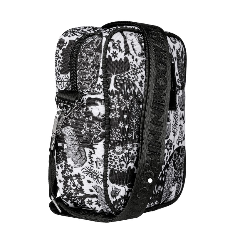 En praktisk Mumin axelremsväska i vattenavvisande polyestercanvas. Väskan har ett blixtlås upptill och en blixtlåsförsedd innerficka. Framtill finns det ett roligt Mumin-broderi. Den justerbara axelremmen (135 cm) är löstagbar och helmönstrad med Moomin loggan ton-i-ton. Tillverkad i återvunnen polyester.